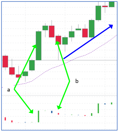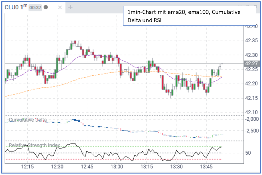 Das Cumulative Delta zeigt das Volumen von Kauf und Verkauf im Zeitverlauf. Wenn der Preis mit Volumen stark hochgeht (a), dann ohne Volumen stark zurück (b), kann man kaufen (siehe auch Pullback in 2.3). Im Optimalfall bleibt der Preis oberhalb von ema20 (gestrichelte Linie). Die Darstellung des Cumulative Delta im TSTrader ist leider nicht optimal, kleine Bewegungen sieht man eher schlecht. Grün ist Kaufvolumen, rot ist Verkaufsvolumen, blau und grau sind eher neutral.