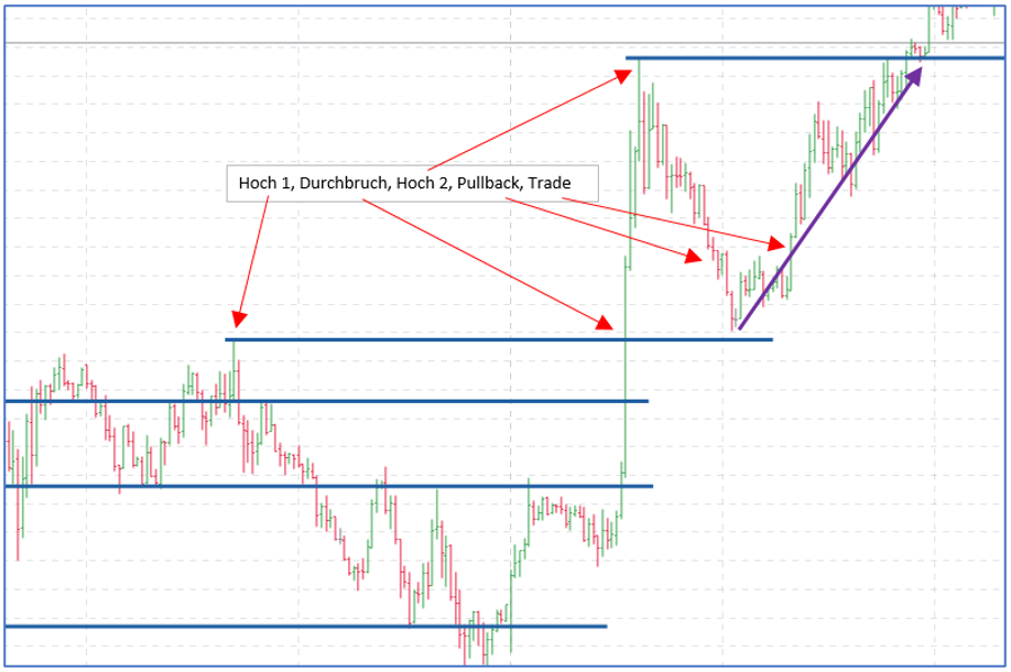 schneller Durchbruch, neues Hoch, Preis kommt zum letzten Hoch zurück   |   kaufen   |   Pullback   |