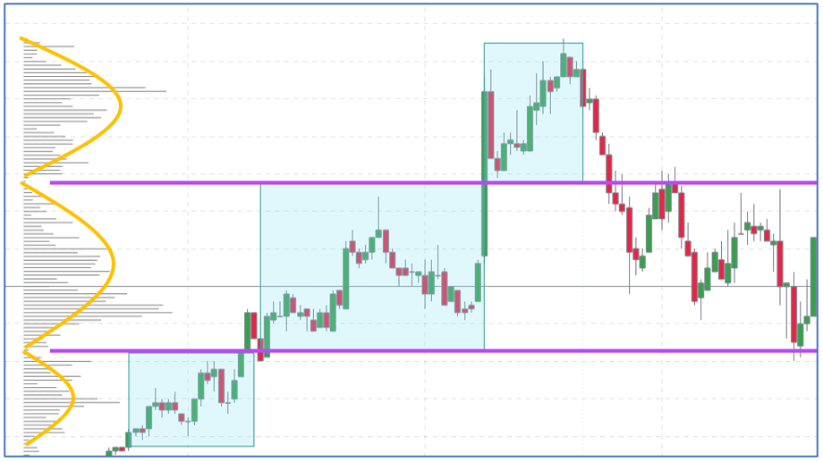 In der "Market Profile" Theorie von Steidlmayer geht man davon aus, das Preis und Wert verschieden sind. Der Preis ist nur eine Momentaufnahme und nicht identisch mit dem Wert des Produktes. Der Wert ergibt sich aus dem Mittel des Preises über die Zeit. Wenn sich die Marktteilnehmer einig über den Wert des Produktes sind, oszilliert der Preis um den Wert (Range-Modus) und der Wert bleibt relativ konstant. Wenn die Marktteilnehmer sich nicht einig sind, gibt es Preissprünge (Trend-Modus) bis ein neuer Wert gefunden ist, um den der Preis dann wieder schwanken kann. Die Value Area (VA) bezeichnet den Bereich, in dem 70 Prozent des gehandelten Volumens ist. Der Point of Control (POC) ist der Preis, an dem am meisten Volumen gehandelt wurde. Das Volumen wird hier auf der y-Achse des Charts dargestellt, also vertikal, als Summe über die Zeit (normalerweise seit Anfang des Tages oder Handelstages). Die Value Area ist innerhalb der roten Linien, die dünne gelbe Linie bezeichnet den Point of Control.