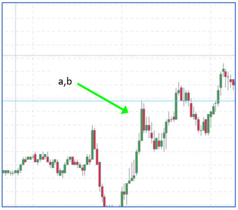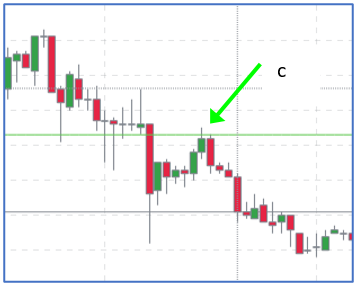 Wenn der Preis das letzte Hoch deutlich durchbricht und dann wieder zurückkommt, wirkt das letzte Hoch häufig als Support (wie bei den Pivot Points im Fall c).